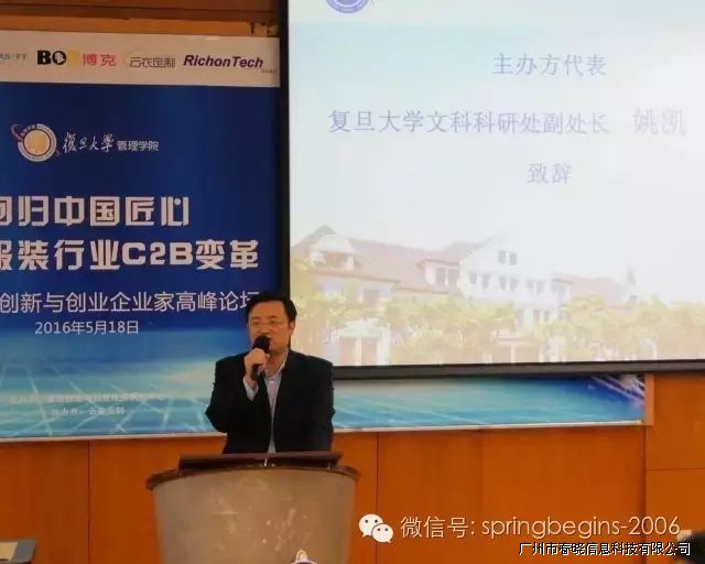 5月18日下午13:00,万众期待的“引领服装行业C2B变革,创新与创业企业家高峰论坛”在复旦大学管理学院如期召开并于下午17:30完美落幕,本次论坛由复旦大学管理学院主办、广州公海jcjc5500信息科技有限公司协助举办,会场内座无虚席,200余人到场参会。论坛邀请了多位资深学者、成功企业家等重磅嘉宾纯干货主题演讲,受到广泛好评,会议进行中掌声持续响起。