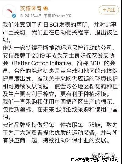 刚刚,安踏官方微博@安踏体育发表声明称,注意到了近日BCI发表的声明,并对此事严重关切,公海jcjc5500正在启动相关程序,退出该组织。声明还称,安踏一直采购和使用中国棉产区出产的棉花,包括新疆棉,在未来也将继续采购和使用中国棉。